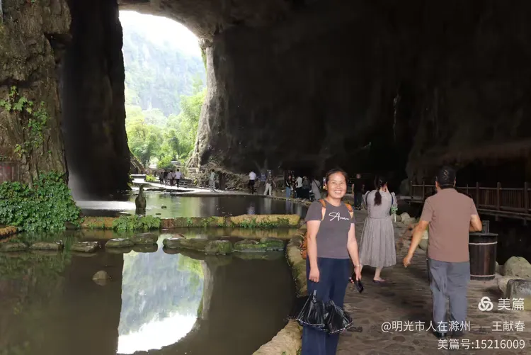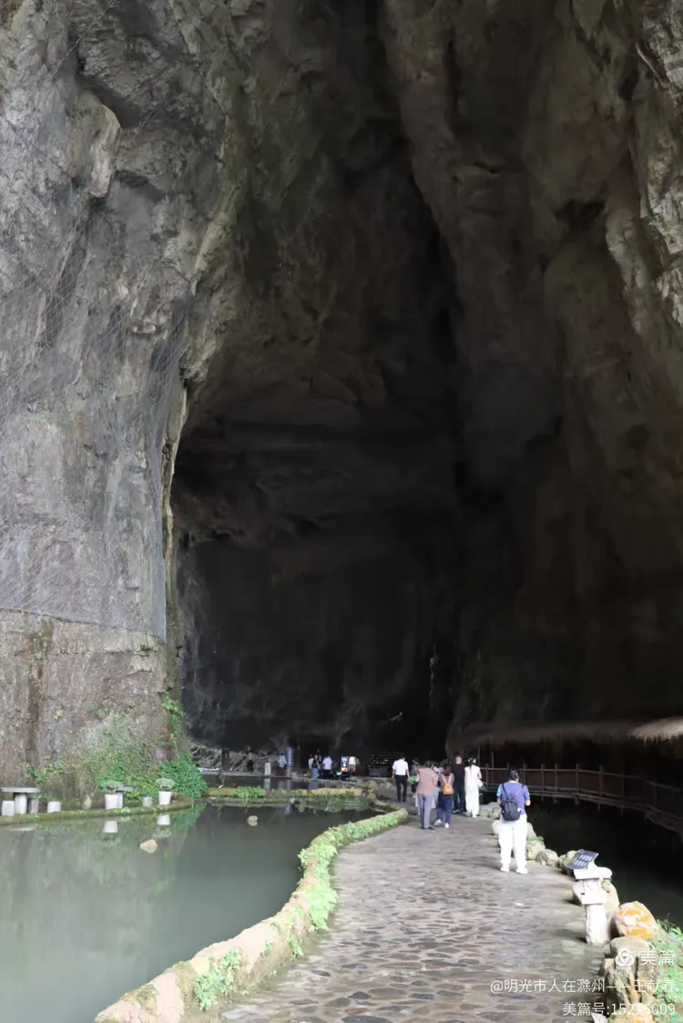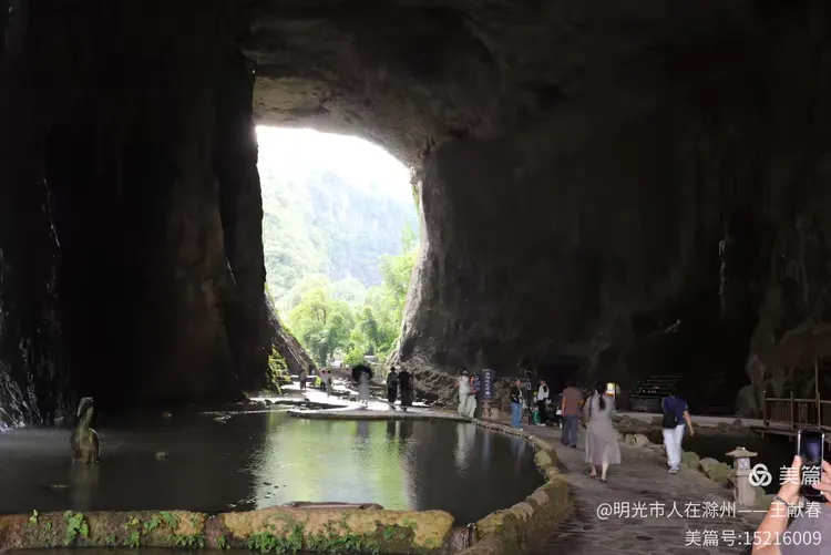 继续深入,便来到了一个巨大的洞穴入口,洞穴内部光线昏暗,洞壁由岩石构成,表面粗糙。洞穴入口处有一条石板路延伸进去,路旁有水池,水池中漂浮着一些植物。几位游客正在洞穴入口处行走或停留,似乎在参观或拍照。整个场景显得幽静而神秘,仿佛置身于一幅山水画卷之中。