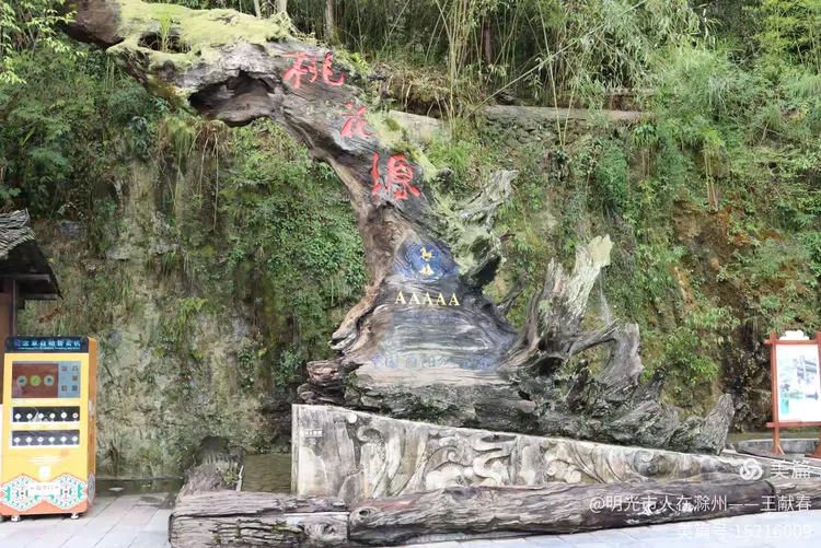 走进景区,最先映入眼帘的是一块巨大的树根雕塑,上面刻着“桃花源”三个大字,仿佛在诉说着这片土地的古老传说。雕塑背后是一片茂密的竹林,竹影婆娑,与岩石相映成趣。旁边还设有自动售货机和指示牌,为游客提供便利的同时,也巧妙地将自然与人文结合在一起,让人感受到一种别样的和谐。