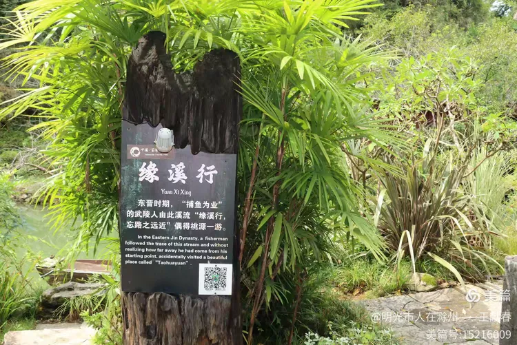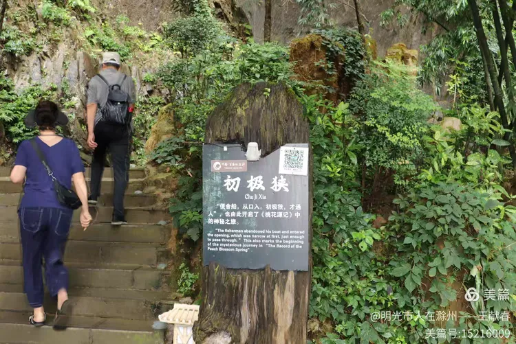 继续深入,便来到了一条小径,小径蜿蜒穿过茂密的竹林,尽头是一个天然的石洞,洞口被绿色植物环绕,环境幽静。洞口上方悬挂着一块标有“初极狭”的木牌,牌上附有二维码和文字说明。几位游客在洞口前拍照或参观,仿佛在追寻历史的足迹。整个场景显得幽静而神秘,仿佛置身于一幅山水画卷之中。