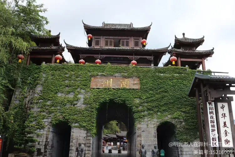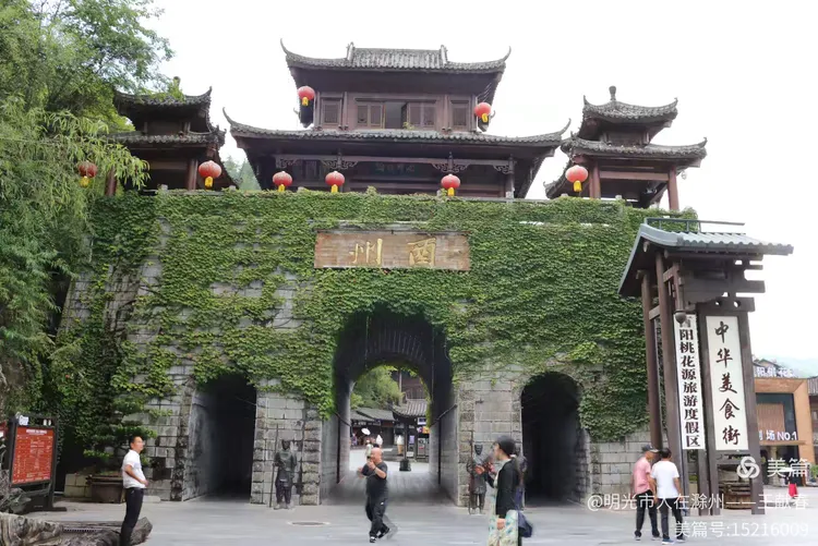 穿过入口,眼前出现一座古色古香的牌坊,牌坊上覆盖着绿色植物,显得古朴而富有生机。牌坊上有“酉州”两个大字,两侧悬挂着红灯笼,增添了几分喜庆的氛围。牌坊后方,几位游客正缓缓前行,仿佛在追寻历史的足迹。牌坊右侧的“中华美食街”标识提醒着游客,这里不仅是风景名胜,更是美食的天堂。