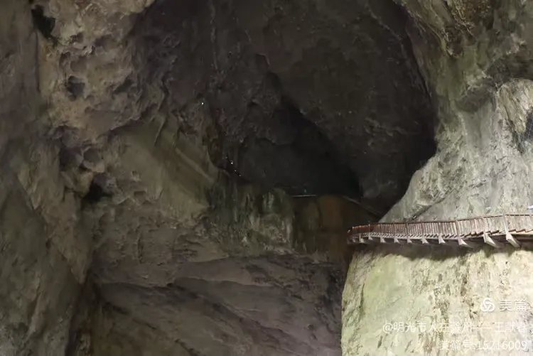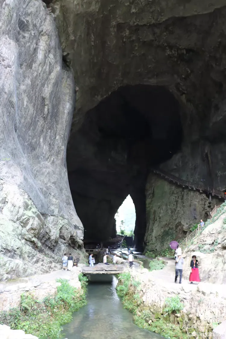 继续深入,便来到了一个天然的石洞,洞口宽阔,洞内黑暗,洞外有一条小溪流过,溪边有几人行走,洞口上方有防护网,洞内似乎有栈道延伸。整个场景显得幽静而神秘,仿佛置身于一幅山水画卷之中。