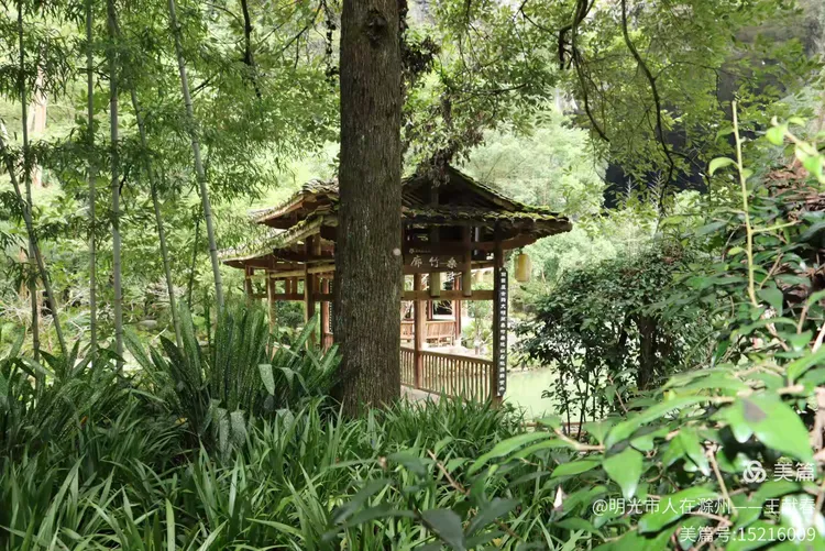 在一片茂密的树林中,有一个木质的凉亭,凉亭周围有木质的栏杆和台阶,凉亭旁边有一个小平台,平台上也有木质的栏杆。凉亭和平台被绿色的植被环绕,远处可以看到岩石的山壁。几位游客在凉亭前拍照或欣赏风景,其中一位游客正用手机拍摄。整体环境显得宁静而自然,充满了自然的气息。