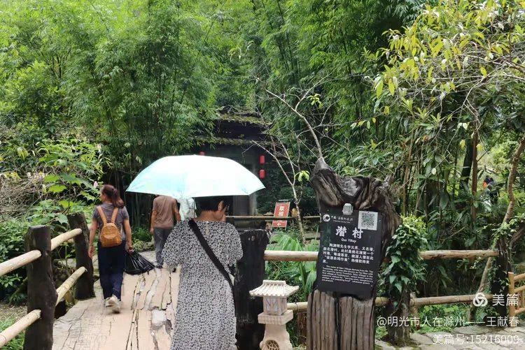 继续前行,便来到了一条木质的小桥,桥上和桥边有几个人在行走,桥边有一个木制的围栏,围栏旁边立着一块标牌,标牌上写着“潜村”,背景是茂密的竹林和树木,环境显得