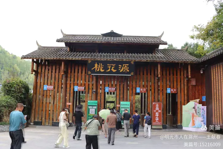 继续前行,便来到了“桃花源”的入口。木质结构的门和屋顶古朴典雅,门上悬挂的“桃花源”三个大字在阳光下熠熠生辉。几位游客正在门口排队或行走,背景是郁郁葱葱的植被和树木,入口处还设有指示牌和二维码,方便游客了解景区信息。站在入口前,仿佛能感受到时光倒流,穿越回那个充满诗意的世外桃源。
