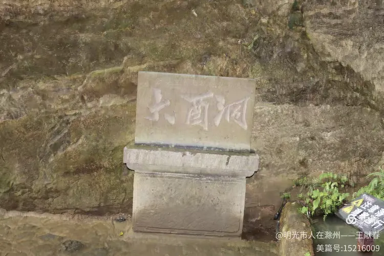 继续深入,便来到了一处天然的洞穴入口。洞口上方悬挂着一块标有“桃花洞”字样的牌匾,周围被茂密的绿色植被环绕,洞口深邃而神秘,仿佛通向另一个世界。洞内光线昏暗,但洞口处透进的自然光照亮了前方的池塘和石阶,几位游客正在洞穴内行走或停留,似乎在欣赏这里的自然风光。整个场景给人一种宁静而神秘的感觉,仿佛置身于一幅山水画卷之中。
