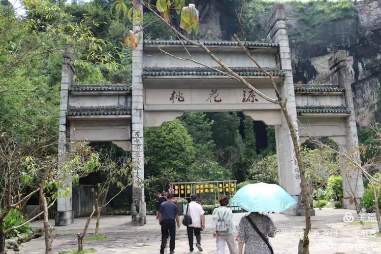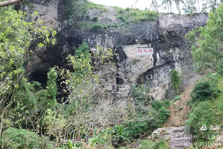 继续深入,便来到了一处天然的洞穴入口,洞口上方悬挂着防护网,洞内光线昏暗,洞外有几位游客在行走,其中一人撑着紫色雨伞,显得格外醒目。洞口附近有木质栈道和建筑结构,环境显得宁静而自然。洞口上方的“桃花源”牌匾仿佛在诉说着这片土地的神秘与美丽,让人不禁想要一探究竟。