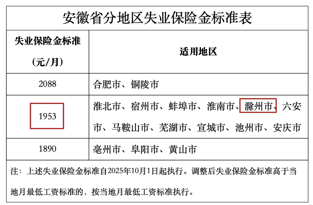 根据《安徽省失业保险规定》《关于进一步推动失业保险经办提质增效的通知》(皖人社秘〔2025〕161号)等有关规定,依据《安徽省人民政府办公厅关于调整全省最低工资标准的通知》(皖政办秘〔2025〕32号)明确的全省最低工资标准,决定自2025年10月1日起,对我省现行失业保险金标准进行相应调整。