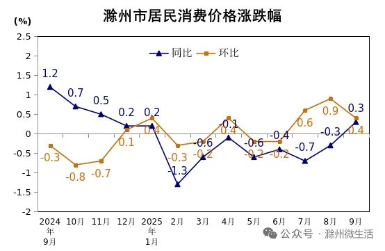 9月份,滁州市居民消费价格环比上涨0.4%,涨幅比上月回落0.5个百分点。其中,食品价格上涨1.9%,非食品价格与上月持平;消费品价格上涨0.7%,服务价格下降0.2%。