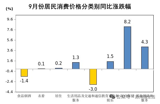 其他七大类价格同比六涨一降。其中,医疗保健价格上涨8.2%,其他用品和服务价格上涨4.3%,教育文化和娱乐价格上涨1.5%,生活用品及服务价格上涨1.3%,居住价格上涨0.2%,衣着价格上涨0.1%;交通和通信价格下降3.0%。