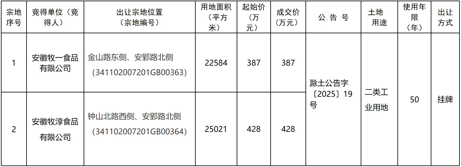 2025年10月11日,滁州市自然资源和规划局在市公共资源交易中心通过挂牌方式出让成交2宗国有建设用地使用权,根据《招标拍卖挂牌出让国有建设用地使用权规定》的要求,现将成交结果公告如下: