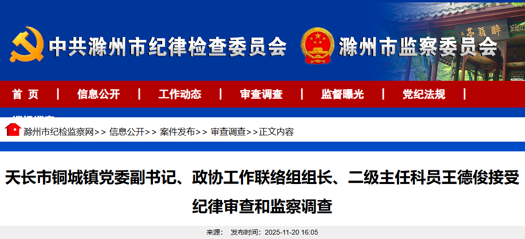 天长市铜城镇党委副书记、政协工作联络组组长、二级主任科员王德俊涉嫌严重违纪违法,目前正接受天长市纪委监委纪律审查和监察调查。(滁州市纪委监委)
