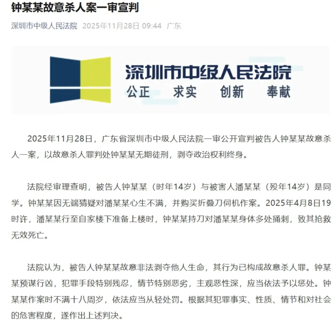 11月28日,深圳“14岁男生刺死同学”案一审被判处无期徒刑。
