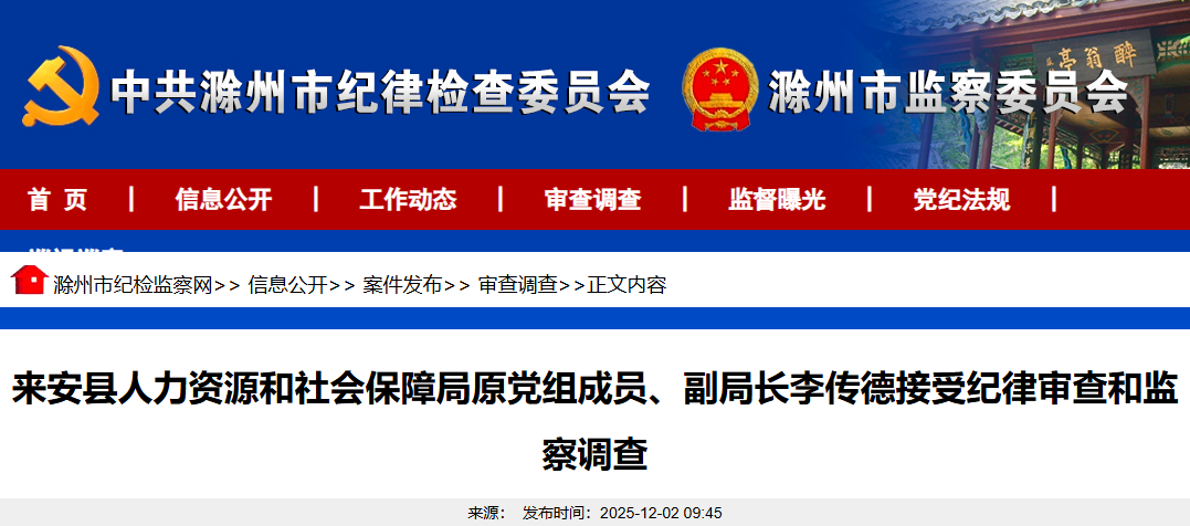 来安县人力资源和社会保障局原党组成员、副局长李传德涉嫌严重违纪违法,经滁州市纪委监委指定管辖,目前正接受滁州市南谯区纪委监委纪律审查和监察调查。(滁州市纪委监委)