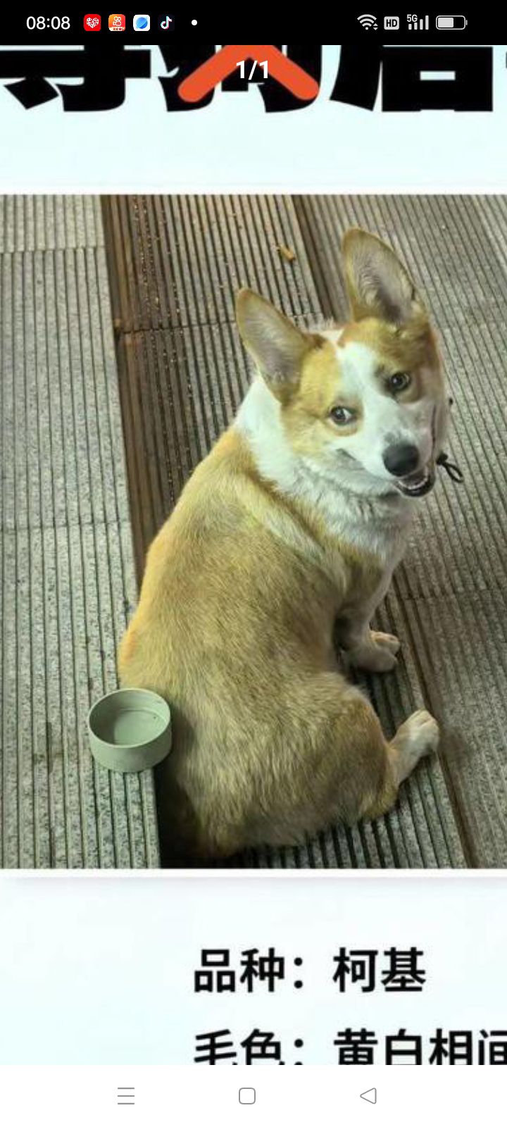 找柯基公狗,在红三环酒店附近丢的,脖子上带着军绿色项圈,国庆丢的
