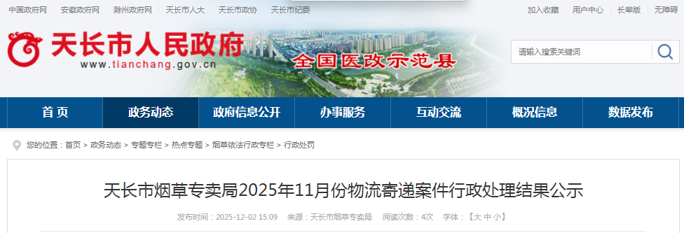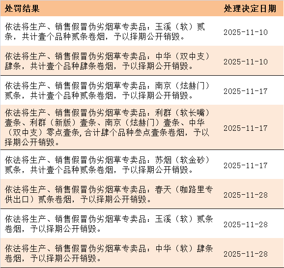 近日,天长市烟草专卖局公示2025年11月份物流寄递案件行政处理结果:11月10日至28日共处理8个批次卷烟快递,依据《烟草专卖行政处罚程序规定》第七十三条规定,将予以择期公开销毁。
