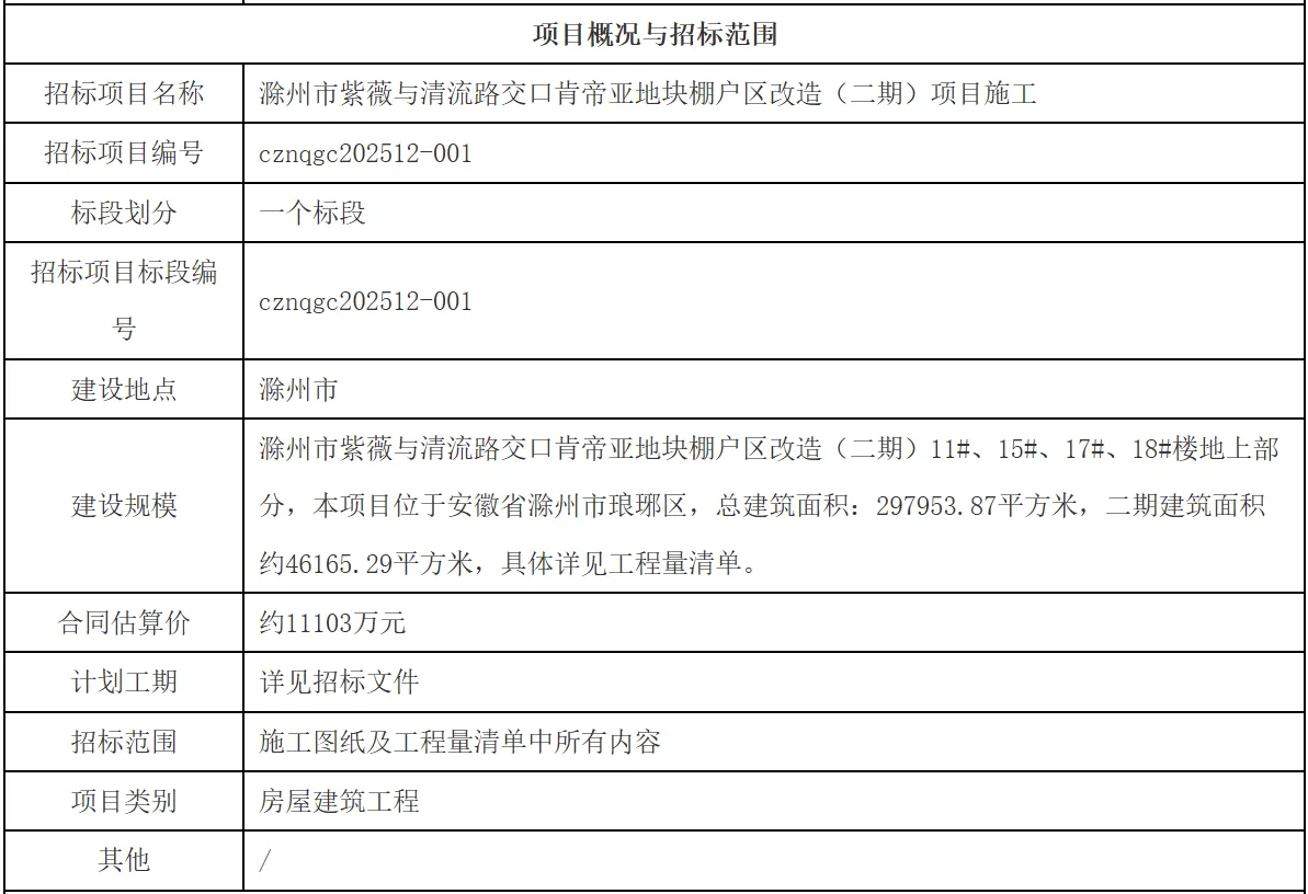 建设规模:滁州市紫薇与清流路交口肯帝亚地块棚户区改造(二期)11#、15#、17#、18#楼地上部分,本项目位于安徽省滁州市琅琊区,总建筑面积:297953.87平方米,二期建筑面积约46165.29平方米,具体详见工程量清单。合同估算价:约11103万元 来源:滁州市公共资源交易中心