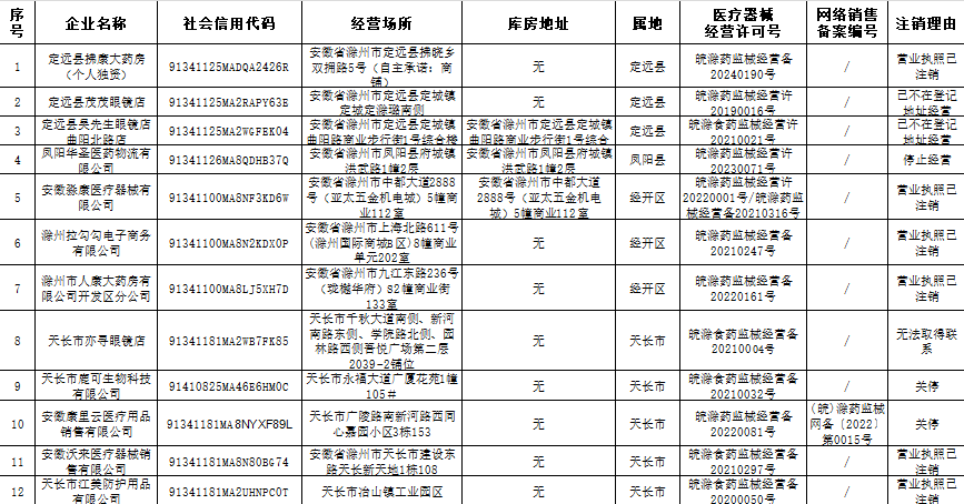 依据《中华人民共和国行政许可法》第七十条、《医疗器械经营监督管理办法》第二十条的规定,我局现对定远县拂康大药房(个人独资)等12家无法取得联系、营业执照已注销、关停的企业(名单见附件)持有的《第三类医疗器械经营许可证》、《第二类医疗器械经营备案凭证》予以公告取消。依据《医疗器械网络销售监督管理办法》第七条第一款的规定,上述企业的《医疗器械网络销售备案凭证》一并取消。
