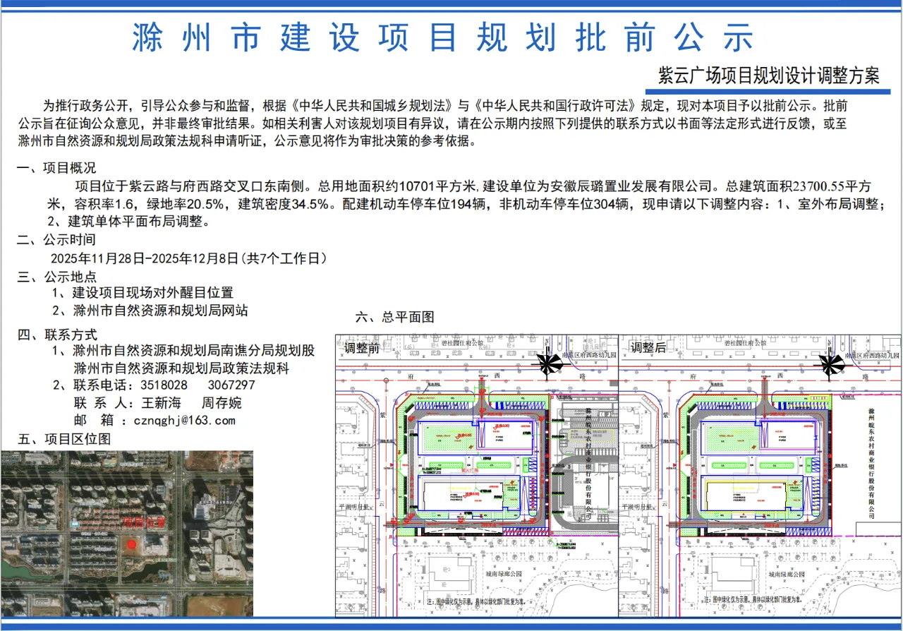 为推行政务公开,引导公众参与和监督,根据《中华人民共和国城乡规划法》与《中华人民共和国行政许可法》规定,现对本项目予以批前公示。批前公示旨在征询公众意见,并非最终审批结果。如相关利害人对该规划项目有异议,请在公示期内按照下列提供的联系方式以书面等法定形式进行反馈,或至滁州市自然资源和规划局政策法规科申请听证,公示意见将作为审批决策的参考依据。