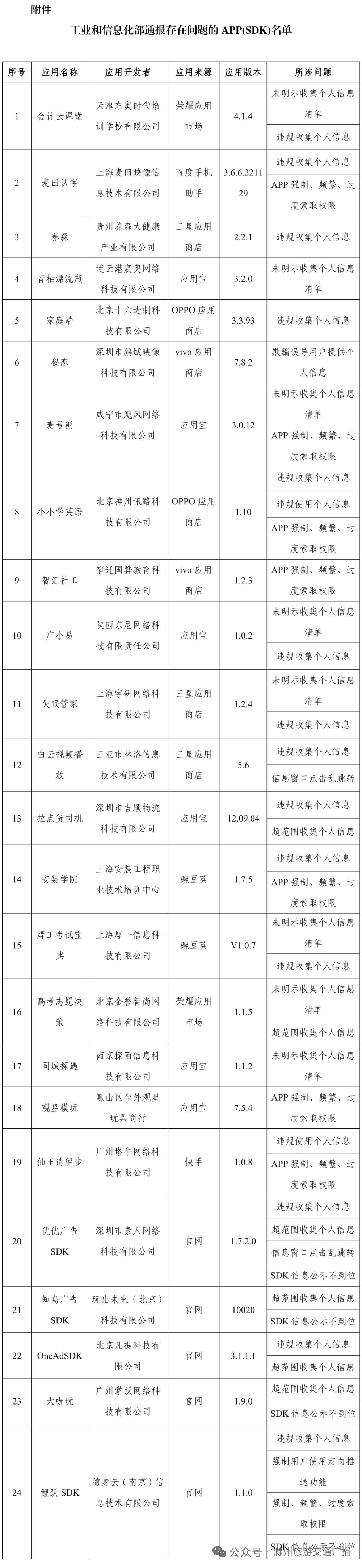 记者12月9日从工业和信息化部获悉,依据相关法律法规,工业和信息化部对APP、SDK(第三方软件开发工具包)违法违规收集使用个人信息等问题开展治理。近期,经组织第三方检测机构进行抽查,共发现24款APP及SDK存在侵害用户权益行为。据悉,上述APP及SDK应按有关规定进行整改,整改落实不到位的,工业和信息化部将依法依规组织开展相关处置工作。