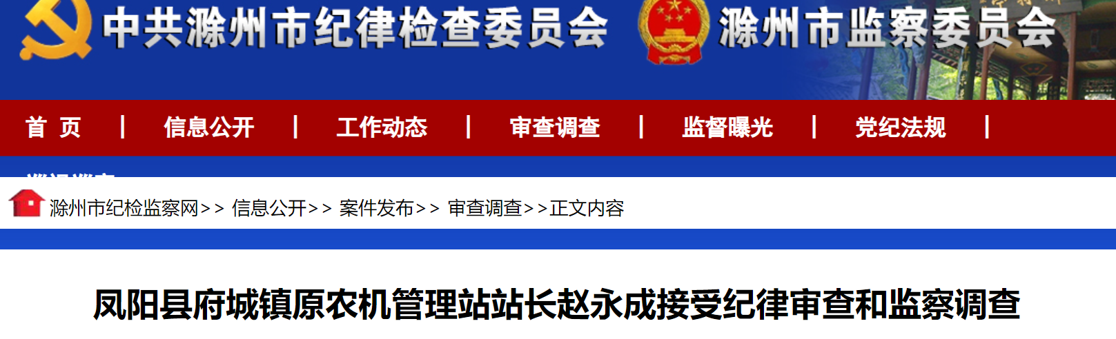凤阳县府城镇原农机管理站站长赵永成涉嫌严重违纪违法,目前正接受凤阳县纪委监委纪律审查和监察调查。(滁州市纪委监委)