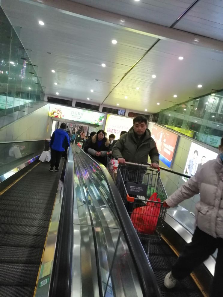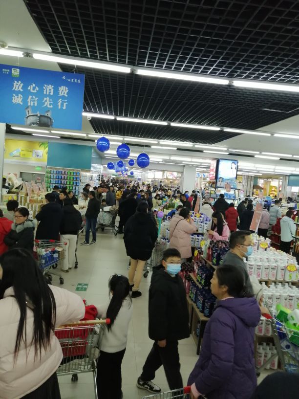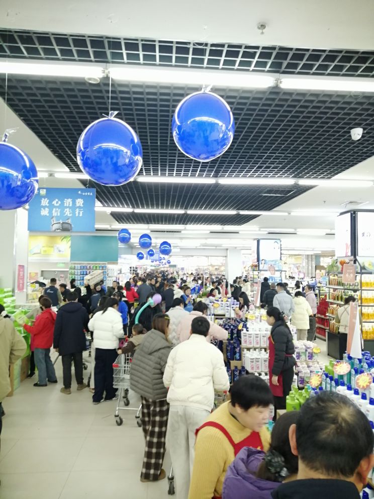 在负一楼白云超市看到,里面挤满了人,用“人山人海、水泄不通”来形容都不为过。连最北侧的备用收银台全部开闸收款,出口自动扶梯上的市民大包小包购买了很多东西。
