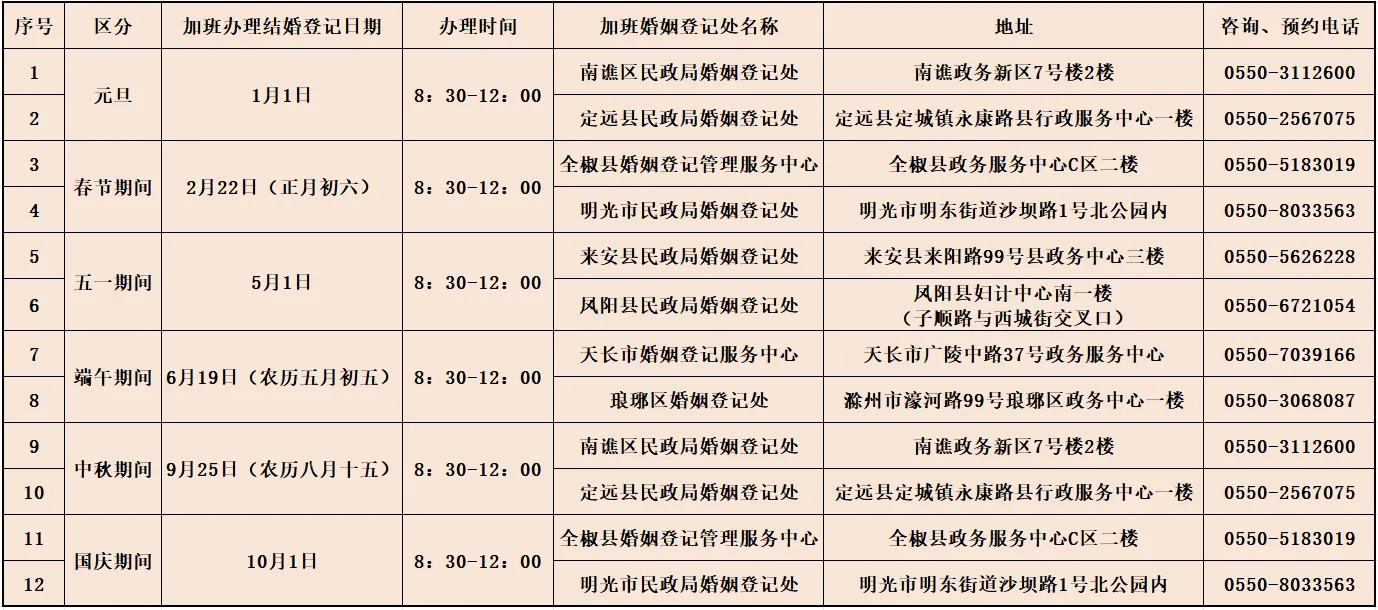 滁州市婚姻登记机关2026年法定节假日加班办理结婚登记业务的通告