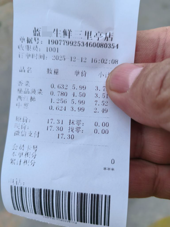 12 月 12 号,在这个蓝*生鲜超市三里亭店购买的中葱。然后有视频,有小票,一次碰洒了蓝板,