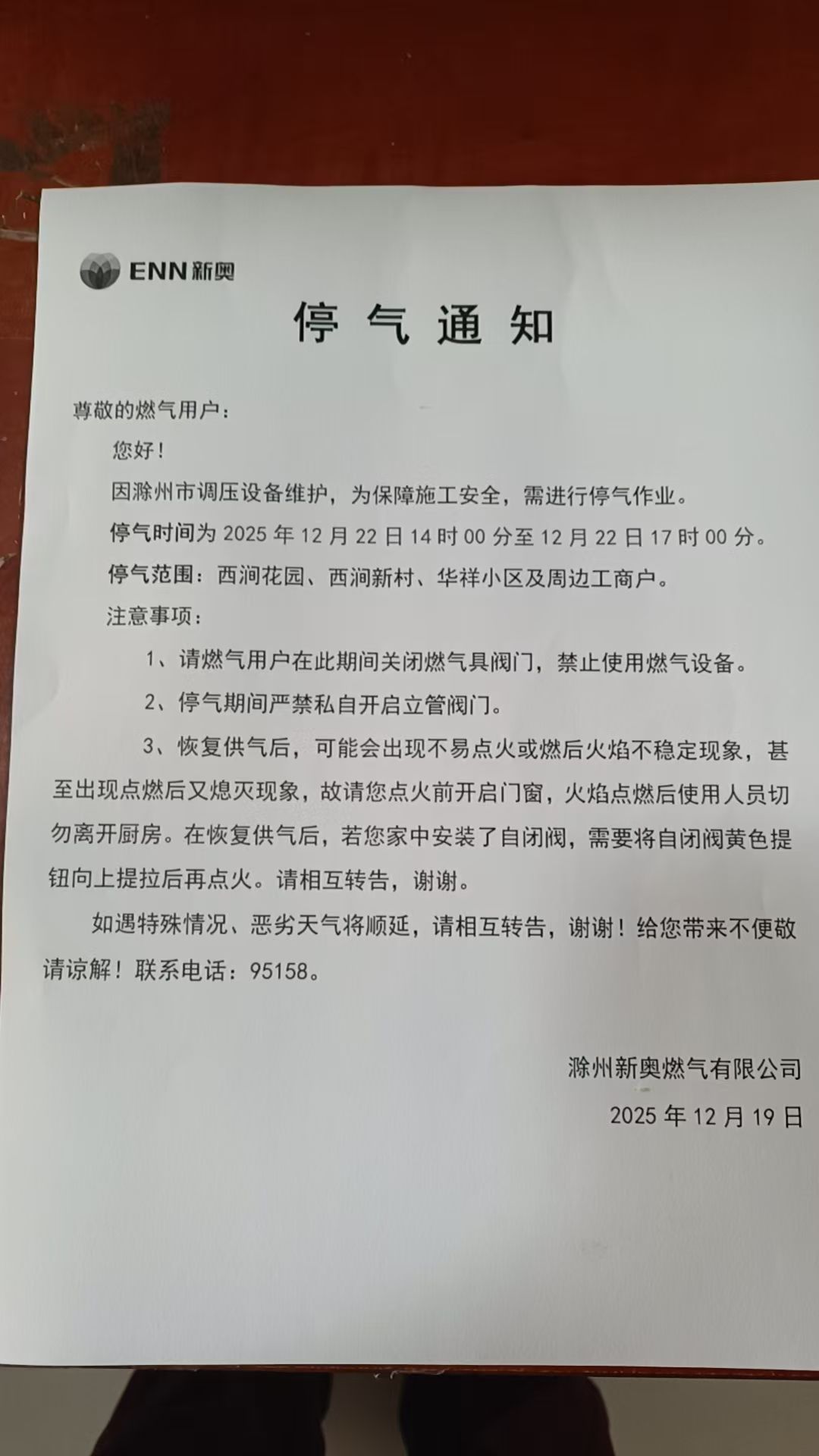 停气时间为2025年12月22日14时00分至12月22日17时00分。停气范围:西涧花园,西涧新村,华祥小区及周边工商户。注意事项: