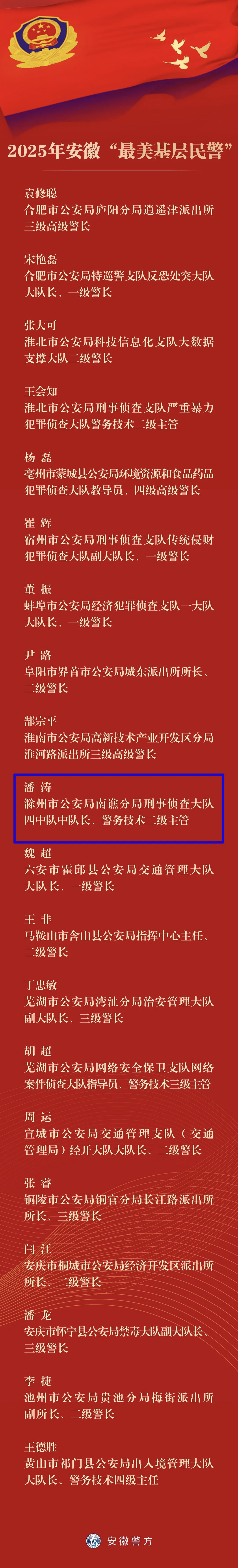 自2025年8月中旬以来,省委宣传部、省公安厅以“阳光下的守护、创新引领未来”为主题,联合组织开展2025年安徽省“最美基层民警”学习宣传活动。经过部署发动、推荐审核等环节,现评选出20名2025年安徽省“最美基层民警”。具体名单如下: