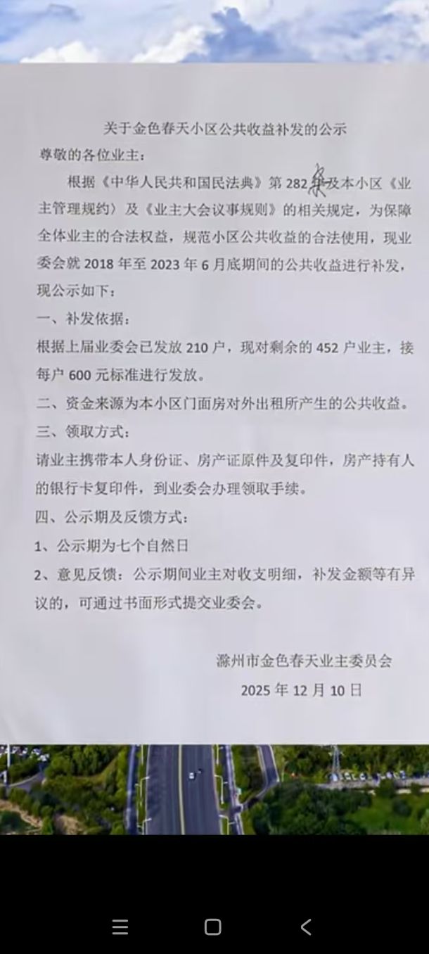 关于金色春天小区公共收益补发的公示 尊敬的各位业主: 为保障全体业主的合法权益,规范小区公共收益的使用与分配,依据《中华人民共和国民法典》及本小区《业主管理规约》《业主大会议事规则》相关规定,业委会现就2018年至2023年6月底的公共收益补发事宜公示如下: 本次补发工作延续上届业委会的分配方案,此前已完成210户业主的收益发放,现针对剩余452户业主,按每户600元的标准统一补发。补发资金全部来源于本小区门面房对外租赁所产生的公共收益,相关收支明细业主可随时向业委会申请查阅。请各位业主携带本人身份证原件及复印件、房产证原件及复印件、房产持有人银行卡复印件,前往小区业委会办公点办理领取手续。 本次公示期为七个自然日,公示期间,业主若对收支明细、补发金额等内容有异议,可通过书面形式提交至业委会,业委会将在3个工作日内予以答复。 滁州市金色春天业主委员会2025年12月10日