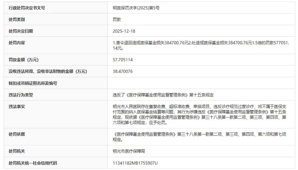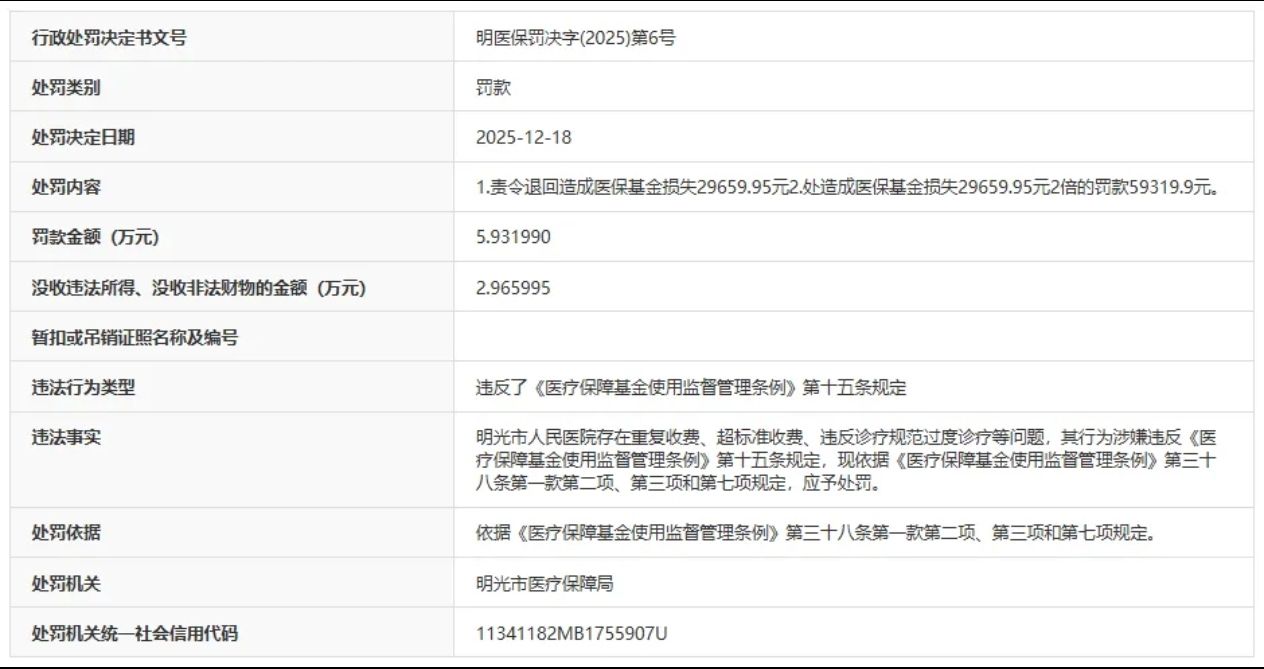 近日,据“信用安徽”公开披露行政处罚信息,明光市人民医院因存在重复收费、超标准收费等问题,一天内被明光市医疗保障局处罚两次,被罚没金额合计超105万元。行政处罚决定书文号分别是明医保罚决字﹝2025﹞第5号、明医保罚决字﹝2025﹞第6号。