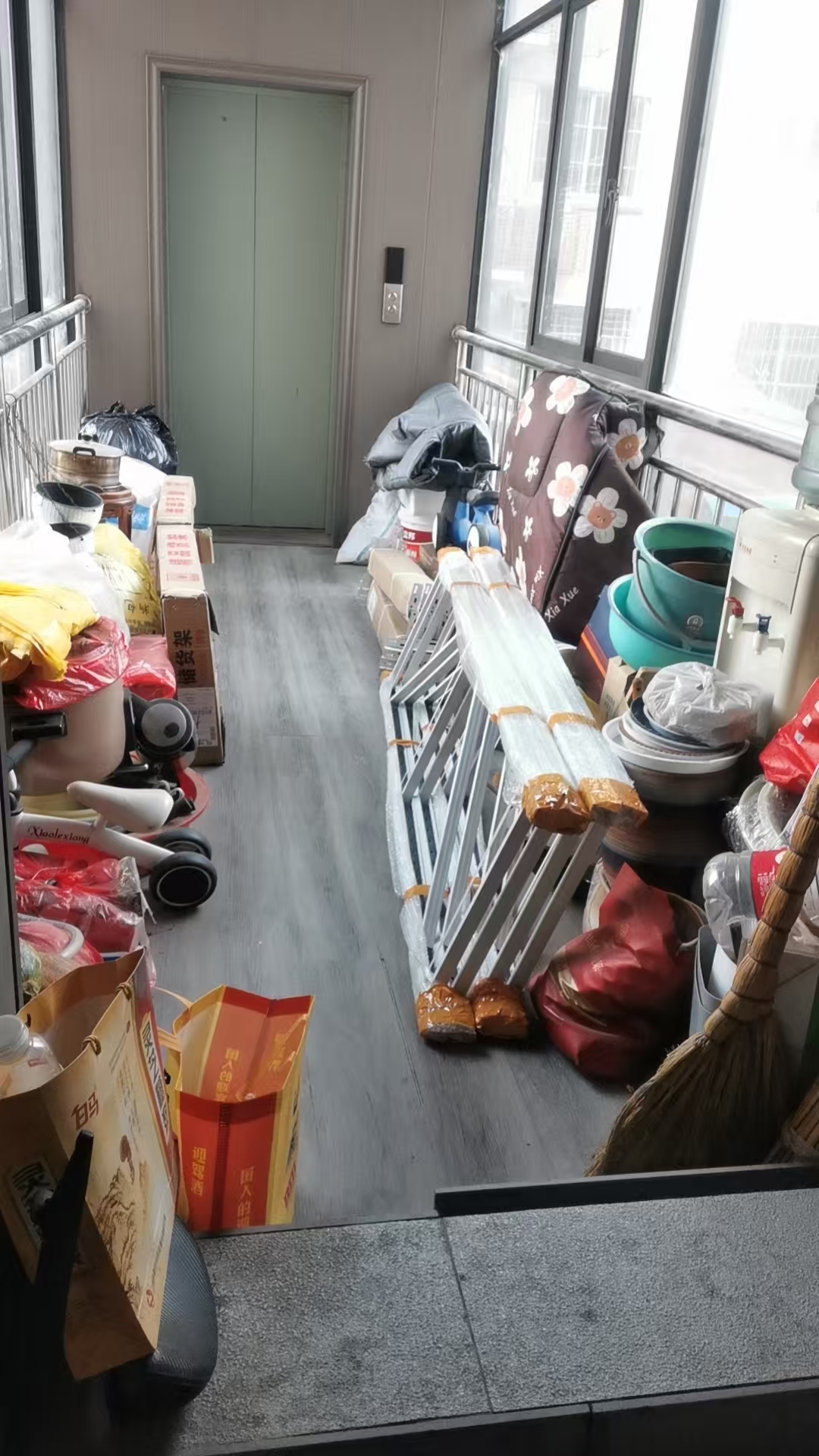 这是小区加装的电梯,三楼廊桥上堆满了杂物,邻居们都觉得这个有安全隐患,找电梯公司也没人来管!