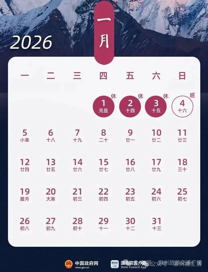 1月1日(周四)至3日(周六)放假调休