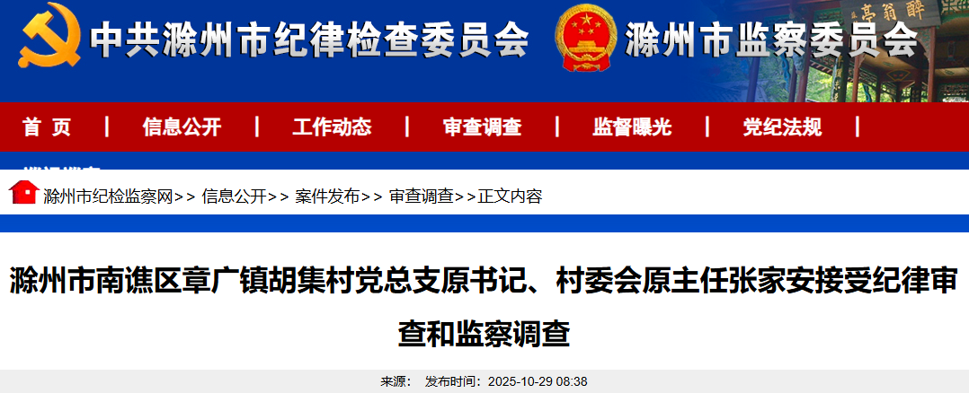 滁州市南谯区章广镇胡集村党总支原书记、村委会原主任张家安涉嫌严重违纪违法,目前正接受滁州市南谯区纪委监委纪律审查和监察调查。(滁州市纪委监委)