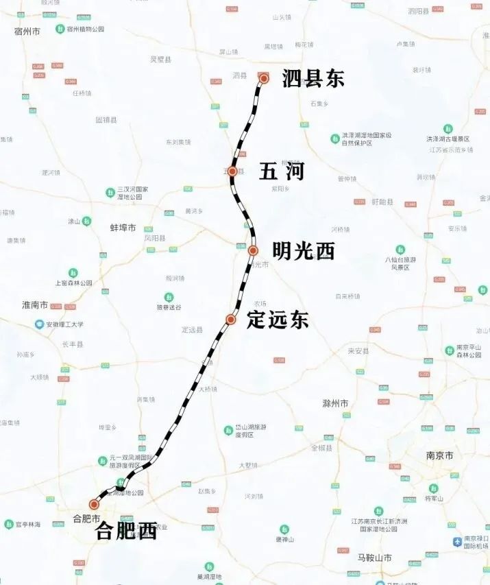 据了解,合新高铁起自合肥市蜀山区的合肥西站,经安徽省滁州市、蚌埠市、宿州市,江苏省宿迁市、徐州市,接入位于江苏省徐州市新沂市的新沂东站,线路全长约335公里,设计时速350公里,实行分段建设,此次开通的为合肥至泗县段,其余区段正在有序推进中。合新高铁合泗段起自合肥西站,经滁州市定远县、明光市,蚌埠市五河县,接入位于宿州市泗县的泗县东站,线路全长198公里,全线共设合肥西、定远东、明光西、五河、泗县东5座车站,均为新建车站。