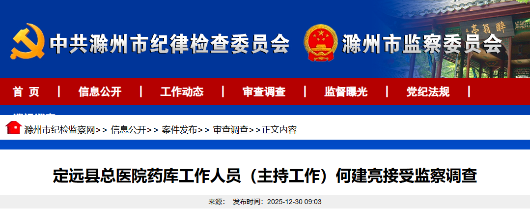定远县总医院药库工作人员(主持工作)何建亮涉嫌严重违法,目前正接受定远县监委监察调查。(滁州市监察委员会)