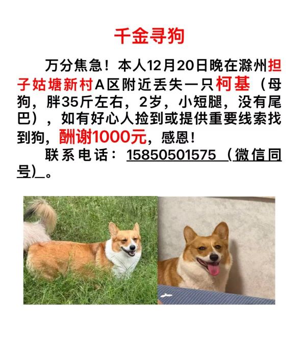 本人于12月20日晚,在滁州担子姑塘新村A区附近走失一只母柯基犬。
