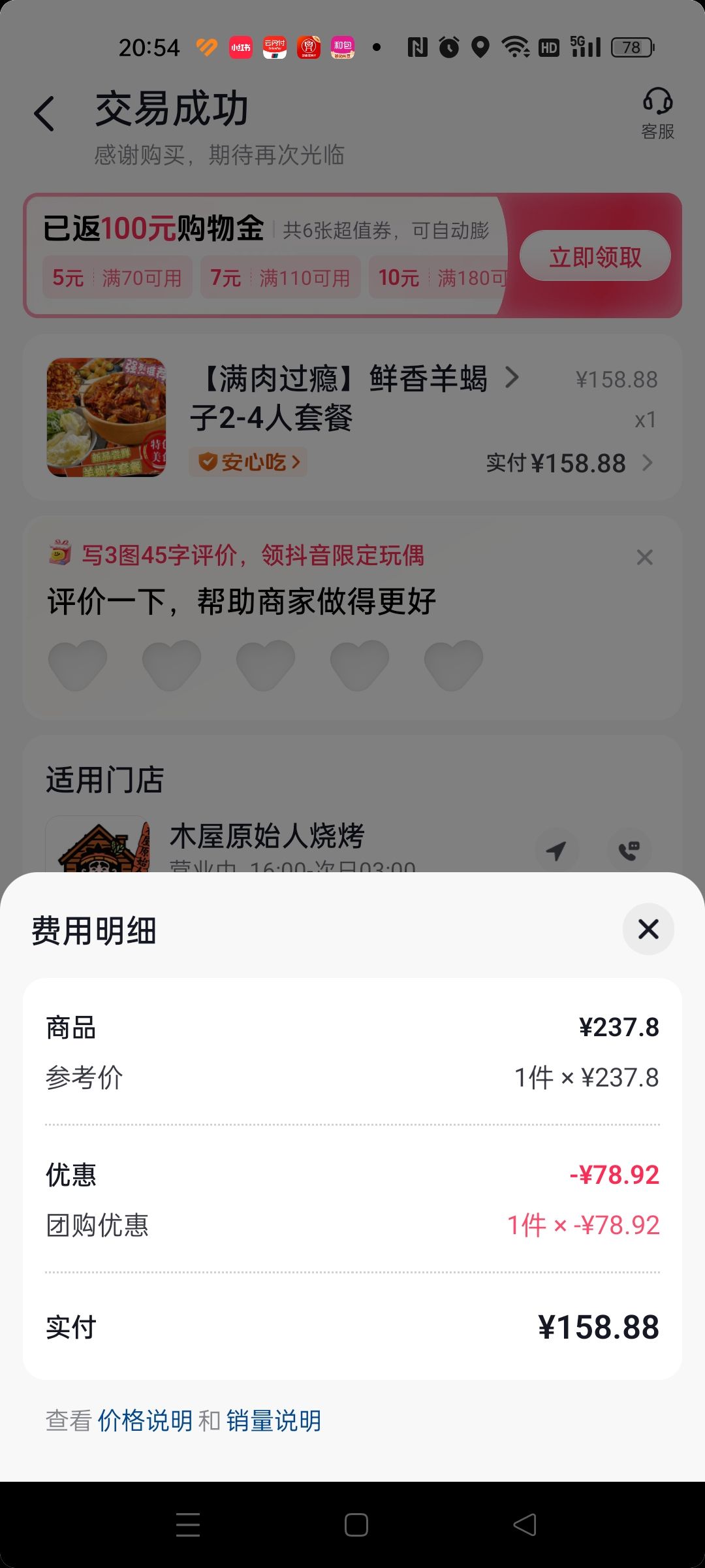 抖音买了158.88的满肉鲜羊蝎子套餐团购券,店里实际打出来的价格是108.88,这都是什么套路,是抖音在坑人,还是商家在坑人,大家消费注意陷阱。