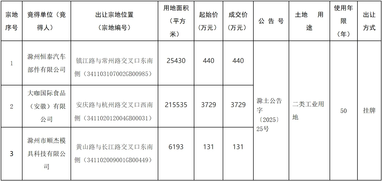 2025年12月31日,滁州市自然资源和规划局在市公共资源交易中心通过挂牌方式出让成交3宗国有建设用地使用权,根据《招标拍卖挂牌出让国有建设用地使用权规定》的要求,现将成交结果公告如下: