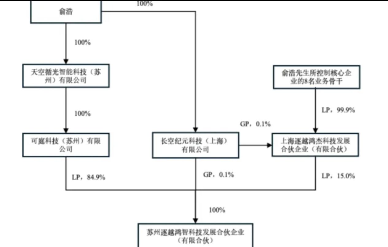 俞浩通过其旗下持股平台进行了相关操作。根据公告中披露的股权架构图显示,俞浩对GP长空纪元有100%控制权,长空纪元系逐越鸿智的执行事务合伙人,直接持有逐越鸿智 0.1%的合伙份额,俞浩通过控制长空纪元控制实现对逐越鸿智的控制。