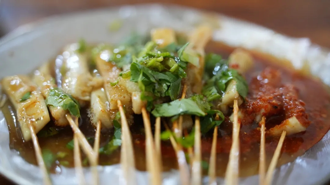 (二) 看那烤架上 哪是普普通通的串 分明是裹着琥珀色的铠甲 浓郁的酱汁 像给鲜肉穿了件红褐色的袍 每一寸肌理都吸饱了鲜香 还没入口 那股霸道的香气直冲天灵盖 让你手还没掏钱 口水先流了三千尺