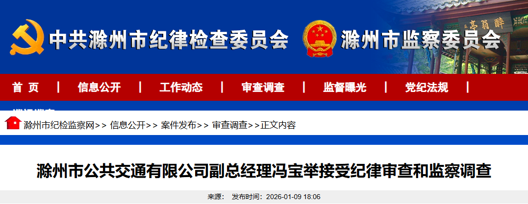 滁州市公共交通有限公司副总经理冯宝举涉嫌严重违纪违法,目前正接受滁州市纪委监委驻市城市投资控股集团有限公司纪检监察组纪律审查;经滁州市监委指定管辖,接受凤阳县监察委员会监察调查。(滁州市纪委监委驻市城市投资控股集团有限公司纪检监察组、凤阳县纪委监委)