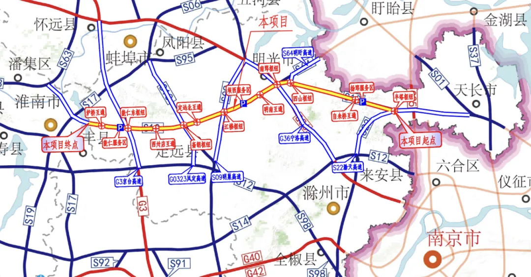 S10扬州至淮南高速公路滁州段路线起自滁州市来安县,止于凤阳县与淮南市交界的高塘湖市界,顺接扬州至淮南高速公路淮南段。路线全长约141.868公里,采用双向四车道高速公路建设标准。该项目是淮南、滁州、扬州三地市之间的重要快速通道,也是我省振兴皖北地区的交通重点项目,在区域路网中的作用十分突出。