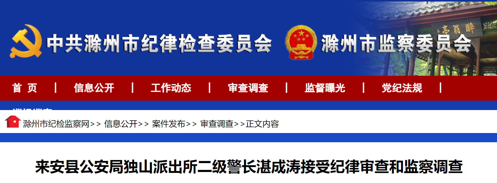 来安县公安局独山派出所二级警长湛成涛涉嫌严重违纪违法,目前正接受来安县纪委监委纪律审查和监察调查。(滁州市纪委监委)