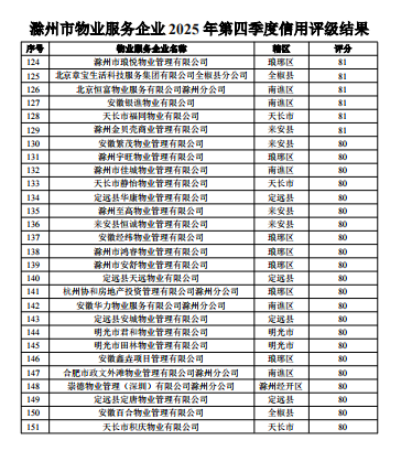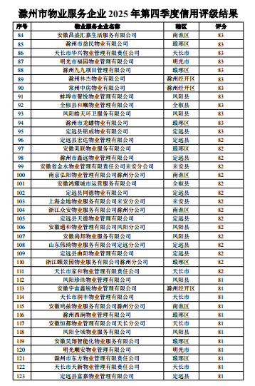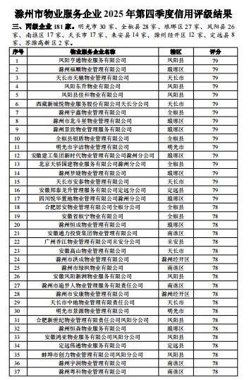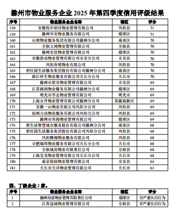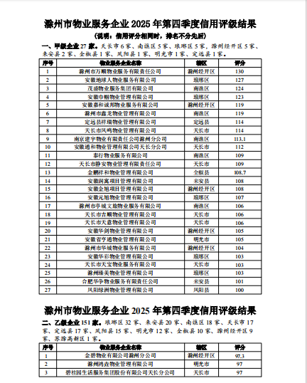 根据《滁州市物业服务企业信用信息管理办法(试行)》,现将截至2025年12月31日全市物业服务企业信用评级结果予以公告。