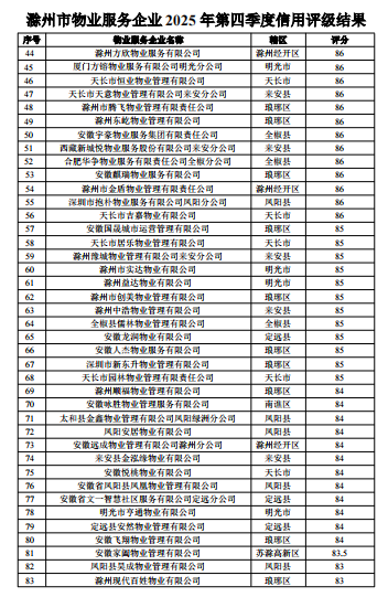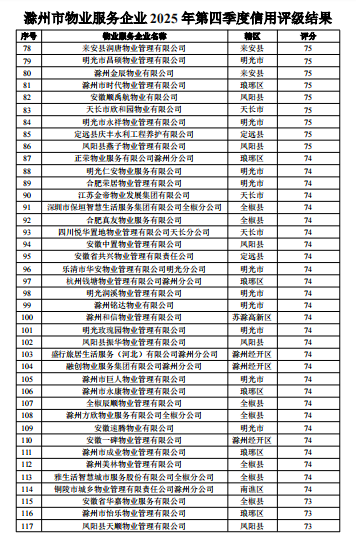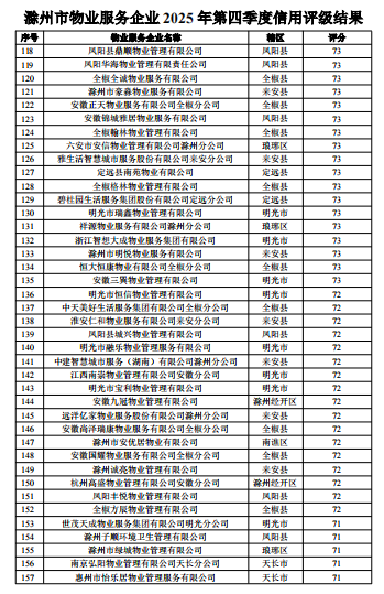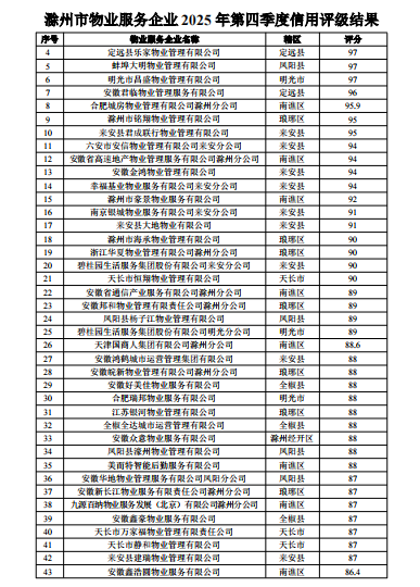 联系电话:0550-3069077附件:滁州市物业服务企业2025年第四季度信用评级结果