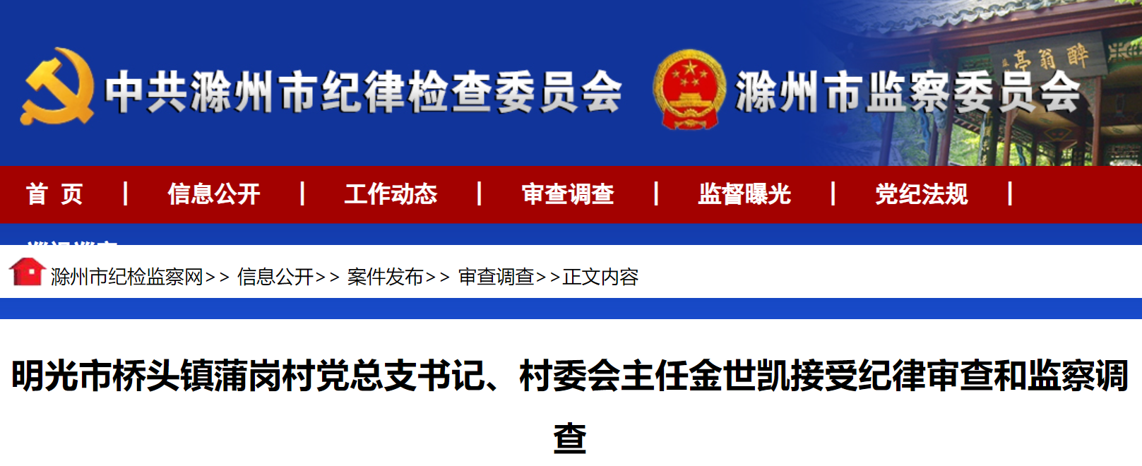 明光市桥头镇蒲岗村党总支书记、村委会主任金世凯涉嫌严重违纪违法,目前正接受明光市纪委监委纪律审查和监察调查。(滁州市纪委监委)