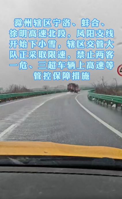 目前滁州辖区宁洛高速、蚌合高速、徐明高速北段,凤阳支线开始下小雪,辖区交管大队正采取限速,禁止两客一危、三超车辆上高速等管控保障措施。