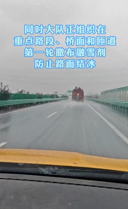 同时大队正组织在重点路段、桥面和匝道第一轮撒布融雪剂。