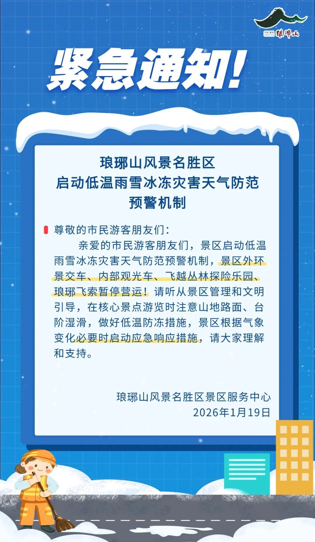 因气象条件变化,琅琊山景区已调整运营安排:外部景交车、内部观光车、飞越丛林探险乐园及琅琊飞索均暂停运营,感谢大家的理解与支持~